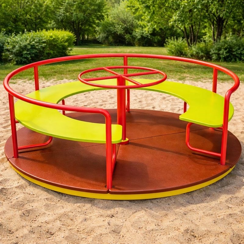Карусель должна иметь габаритные размеры не менее: высота 670 мм, длина 1600 мм, ширина 1600 мм. Карусель должна быть выполнена по типу «вращающаяся платформа» Карусель должна представлять собой сборную конструкцию, состоящую из металлического каркаса, настила и сидений. Металлический каркас должен представлять собой цельносварную конструкцию, состоящую из центральной стойки с закрепленным на ней рулем и платформы с закрепленными на ней перилами. Центральная опора должна быть изготовлена из трубы диаметром не менее 108 мм. Руль должен быть изготовлен из трубы ВГП диаметром не менее 26 мм. Каркас вращающейся платформы должен быть изготовлен из трубы профильной сечением не менее 40х20 мм. Перила вращающейся платформы должны быть изготовлены из трубы ВГП диаметром не менее 33 мм. Сиденье карусели должно быть выполнено из влагостойкой березовой фанеры толщиной не менее 18 мм. Сиденье должно состоять из не менее 5-и сегментов, закрепленных на металлическом каркасе. Настил пола карусели должен быть выполнен из влагостойкой ламинированной фанеры с односторонней рифленой поверхностью толщиной не менее 18 мм.