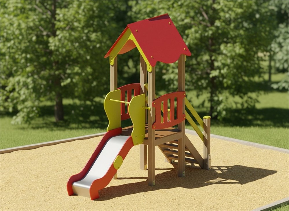 Горка должна состоять из: башня в количестве не менее 1 шт., лестница деревянная в количестве не менее 1 шт, двускатная крыша в количестве не менее 1 шт. фанерные ограждения в количестве не менее 2 шт.,
