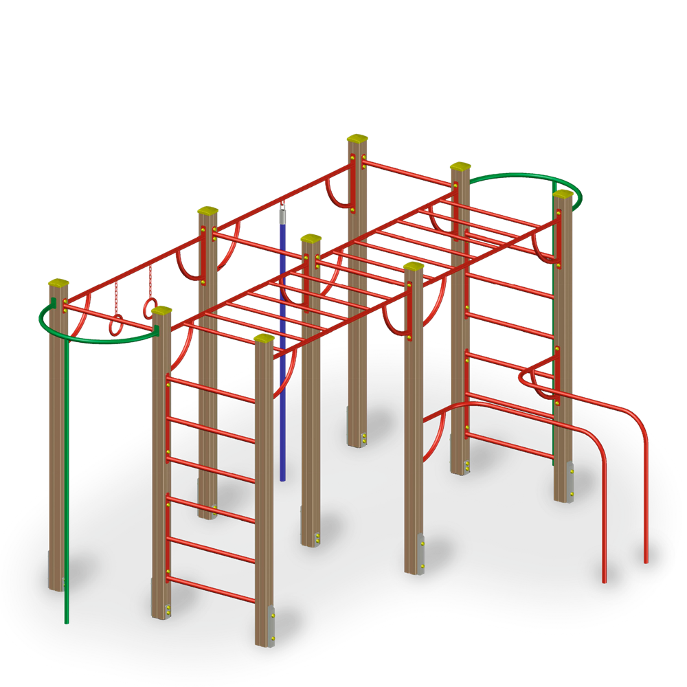 Турники, перекладина с канатом и перекладина с гимнастическими кольцами должны быть изготовлены из трубы ВГП диаметром не менее 33 мм. Гимнастические кольца должны быть выполнены из трубы диаметром не менее 21 мм и должны быть закреплены на перекладине при помощи цепи короткозвенной сечением не менее 6 мм.